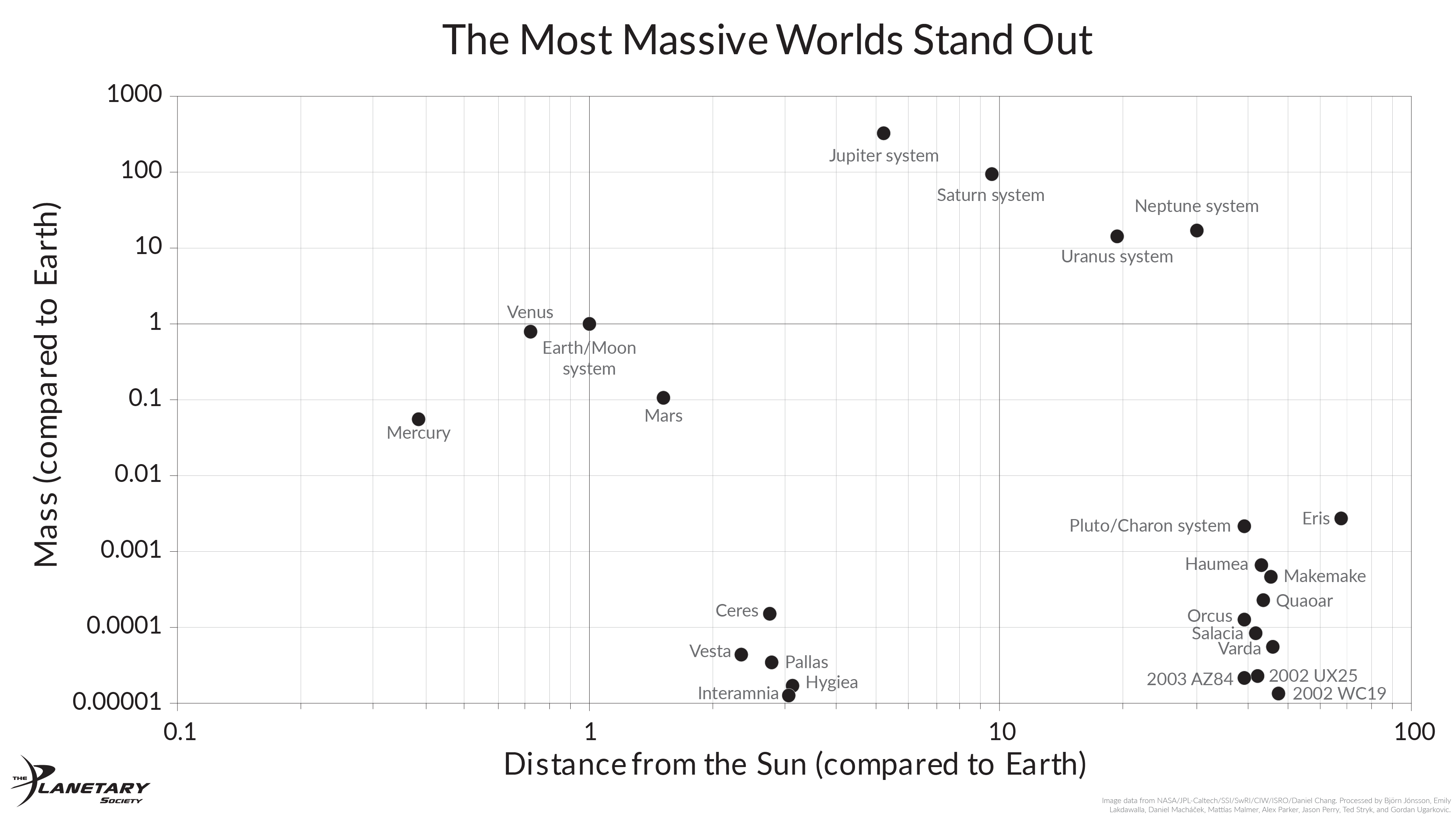 Graph of Planetary Mass Versus Distance From the Sun This chart compares the masses of the planetary systems that orbit the Sun with their distance from the Sun, as compared to Earth's mass and solar distance. Each system—Earth and its Moon, Saturn and its rings and moons, Pluto and its moons—orbits the Sun as one entity, so planet and satellites are lumped together according to their total system mass rather than being shown as separately orbiting worlds. All objects are shown to scale with each other, though of course the distances separating them are not to scale. For the 8 largest bodies, small black “×” symbols denote the precise location of the mass and distance on the chart grid. Emily Lakdawalla for The Planetary Society using image data from NASA/JPL-Caltech/SSI/SwRI/CIW/ISRO/Daniel Chang, processed by Björn Jónsson, Emily Lakdawalla, Daniel Macháček, Mattias Malmer, Alex Parker, Jason Perry, Ted Stryk, and Gordan Ugarkovic