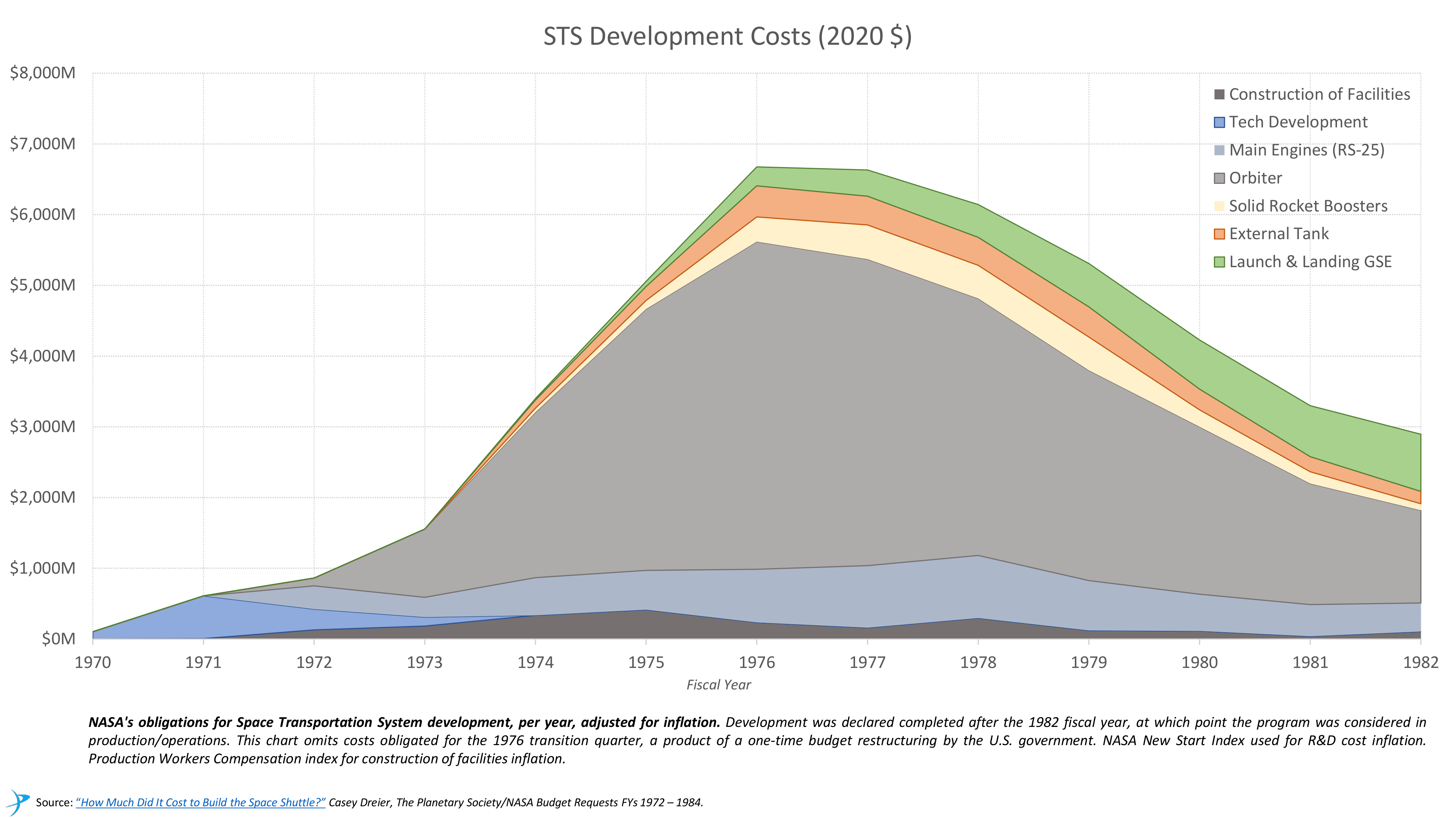 NASA's obligations for Space Transportation System development, per year. Development was declared completed after the 1982 fiscal year, at which point the program was considered in production/operations. This chart omits costs obligated for the 1976 transition quarter, a product of a one-time budget restructuring by the U.S. government. For more detailed information, see the Google spreadsheet source data.