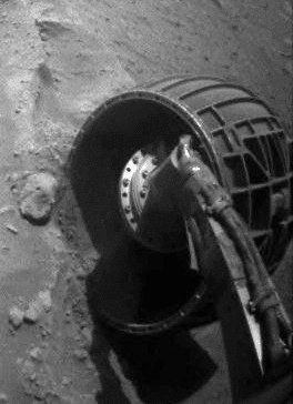 Right front wheel motion on Spirit? Against all expectations, an extremely tiny bit of motion was visible in Spirit's "stuck" right front wheel on sol 2113. NASA / JPL-Caltech / animation by Doug Ellison