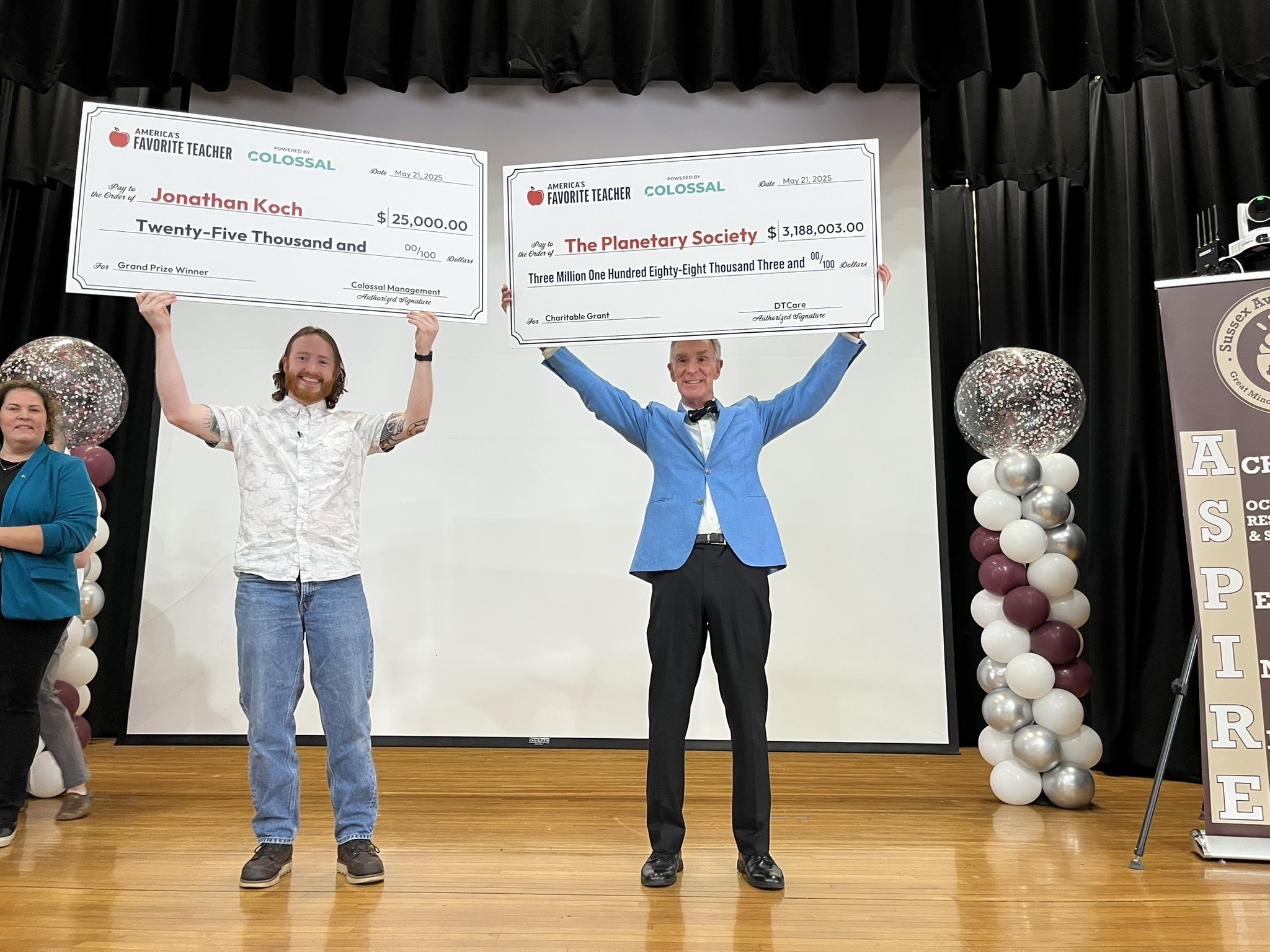 America's Favorite Teacher Second-grade teacher Jonathan Koch from Newark, New Jersey (left) receiving the America's Favorite Teacher prize alongside Planetary Society CEO Bill Nye (right), who received $3.2 million raised through the competition for The Planetary Society. Colossal