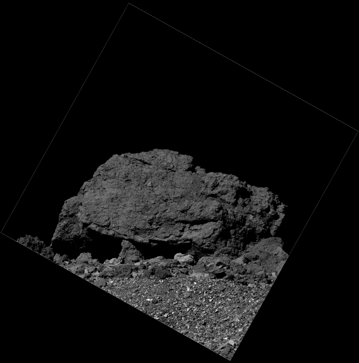 Bennu's Boulder No. 1 This image, taken by the PolyCam camera on NASA’s OSIRIS-REx spacecraft on 29 March 2019 from a distance of 3.6 kilometers, shows Bennu’s largest boulder. The height of the boulder is 21.7 meters. The image was obtained during Flyby 4B of the mission’s Detailed Survey: Baseball Diamond phase. When the image was taken, the spacecraft was over the northern hemisphere, pointing PolyCam down toward the south. NASA/Goddard/University of Arizona/Processed by Jason Davis