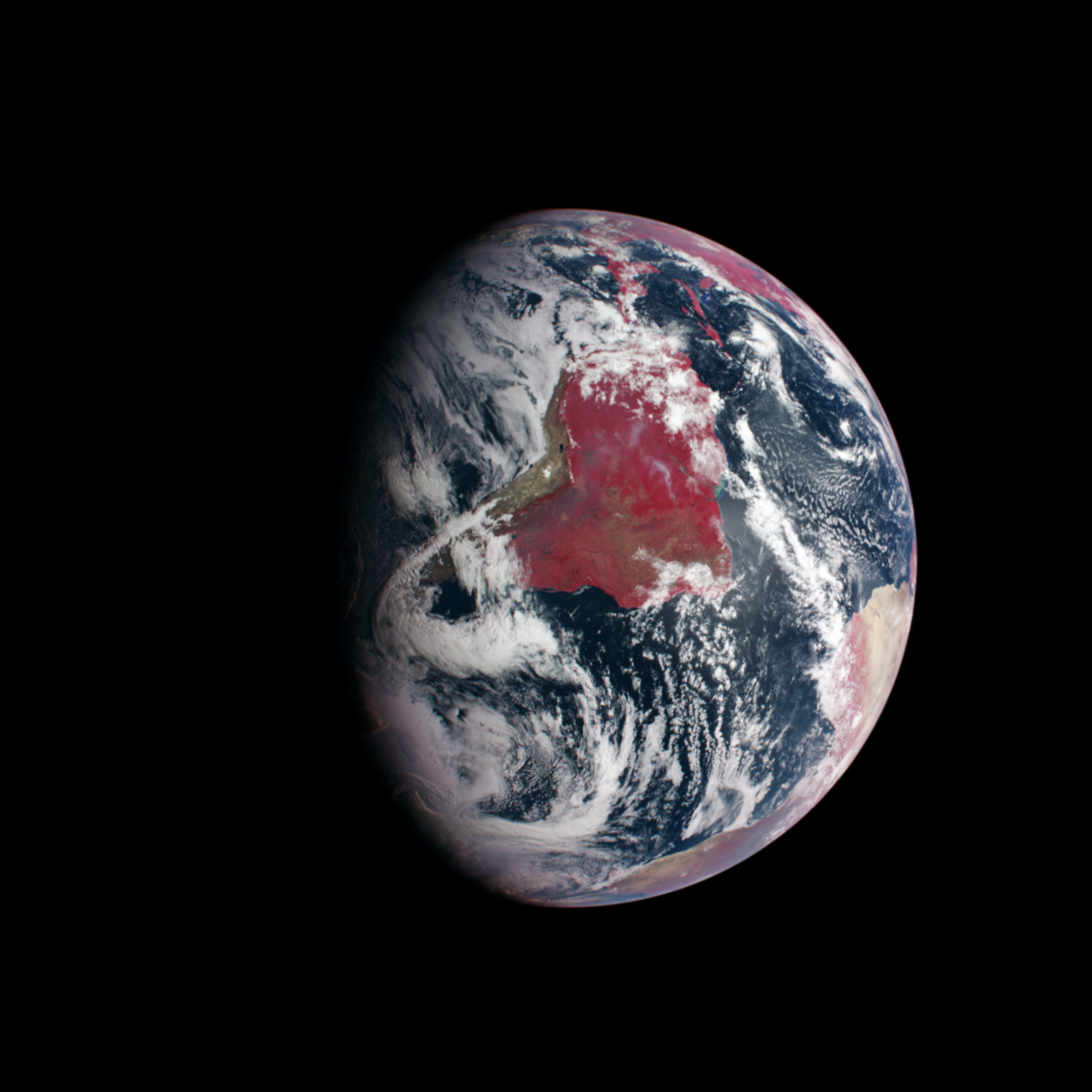 Earth in infrared from MESSENGER Spacecraft destined for other worlds sometimes test their instruments on Earth while en route. On its way to Mercury, NASA’s MESSENGER spacecraft pointed its cameras at Earth. The resulting image shows South America and portions of North America and Africa through visible and near-infrared light filters. Near-infrared light is shown as red in this image. The dense foliage of the Amazon rainforest looks strikingly red here because plants strongly reflect near-infrared light. NASA/Johns Hopkins University Applied Physics Laboratory