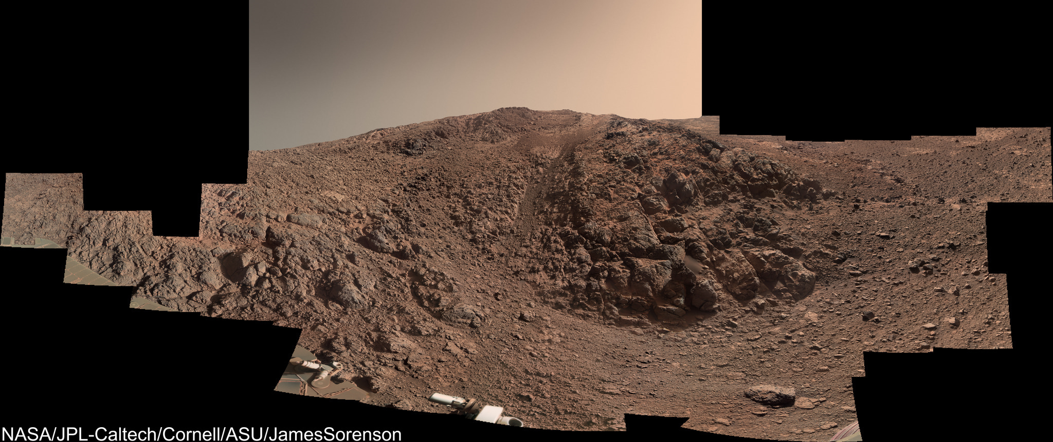 I have made three versions of Knudsen Ridge panorama. One is a guestimated color of what the scene 'may' look like to a person standing there. The other two are a False Color representation which enhances the different subtle colors in rocks and soils, and a 3D anaglyph made using Opportunity's L2 and R2 (Left and Right) Near-IR filters. Full resolutions: Guestimated color: https://www.flickr.com/photos/43581439@N08/25065798471/sizes/o/ False Color: https://www.flickr.com/photos/43581439@N08/25159026645/sizes/o/ 3D Anaglyph: https://www.flickr.com/photos/43581439@N08/25188140325/sizes/o/