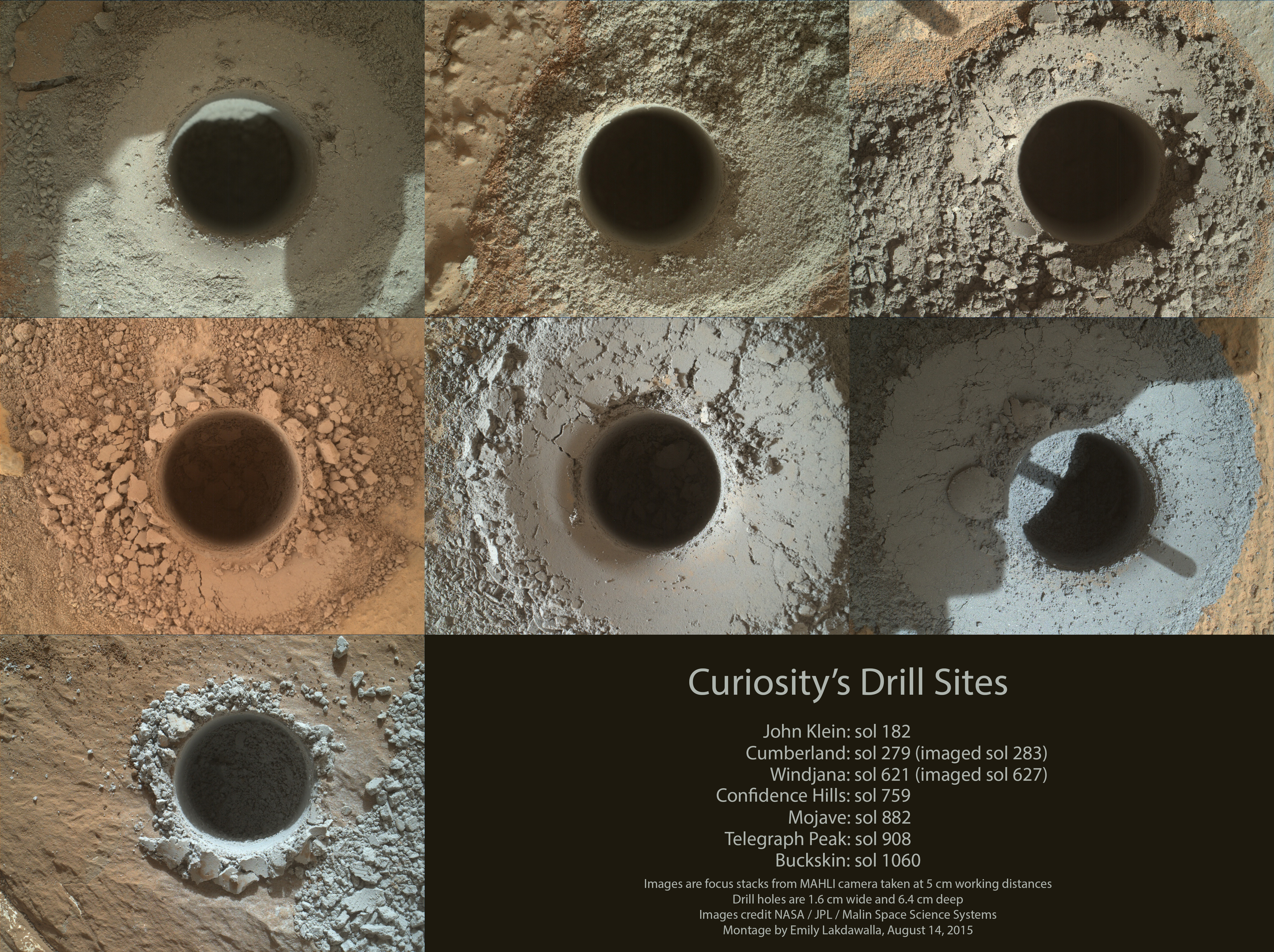 Seven Curiosity drill sites on Mars As of August 2015, Curiosity has drilled and sampled at seven locations on Mars. They are (left to right and top to bottom): John Klein, drilled on sol 182; Cumberland, on sol 279; Windjana, on sol 621; Confidence Hills, on sol 759, Mojave, on sol 882; Telegraph Peak, on sol 908; and Buckskin, on sol 1060. All of these images were taken with the MAHLI camera on the end of the arm from a distance of about 5 centimeters. The drill holes are 1.6 centimeters wide. NASA / JPL / MSSS / Emily Lakdawalla