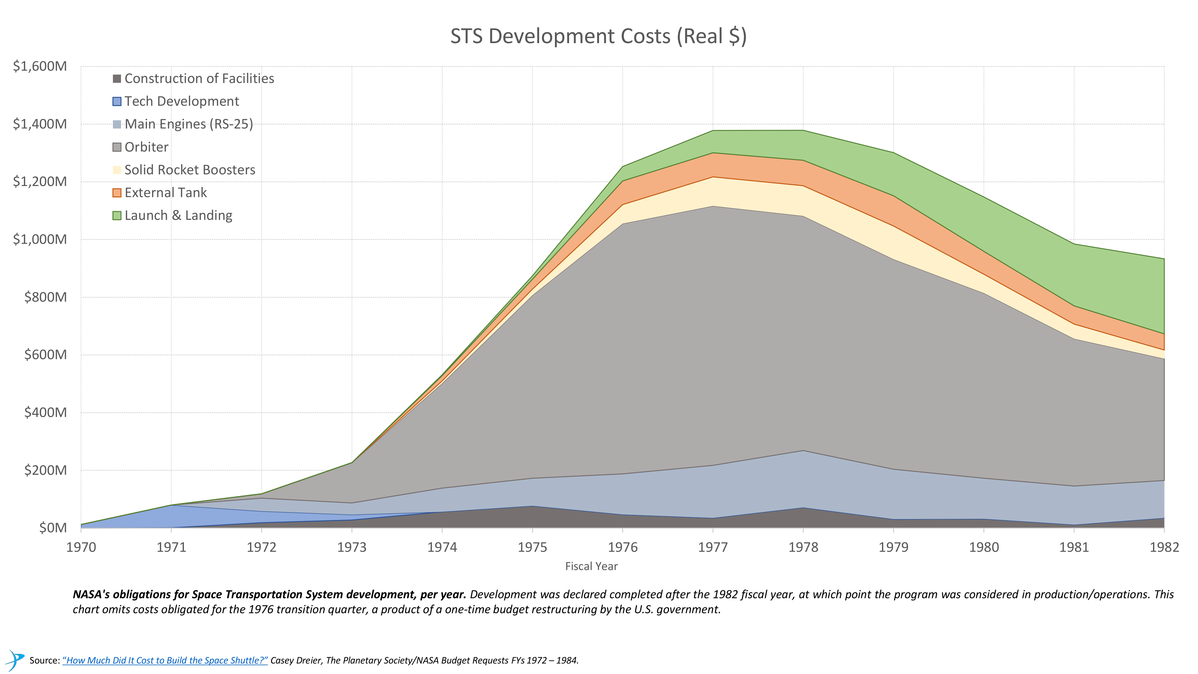 NASA's obligations for Space Transportation System development, per year. Development was declared completed after the 1982 fiscal year, at which point the program was considered in production/operations. This chart omits costs obligated for the 1976 transition quarter, a product of a one-time budget restructuring by the U.S. government. For more detailed information, see the Google spreadsheet source data.