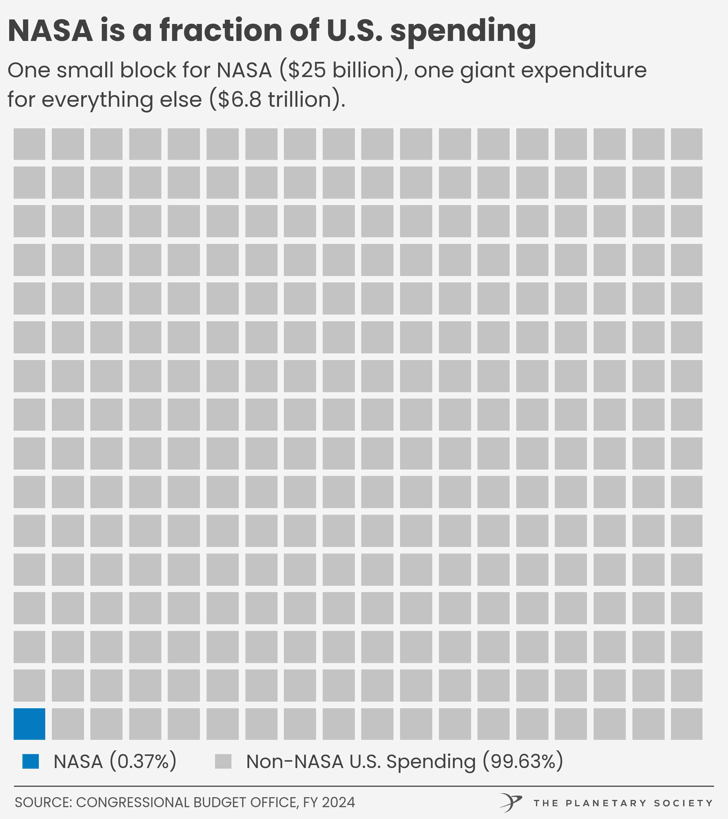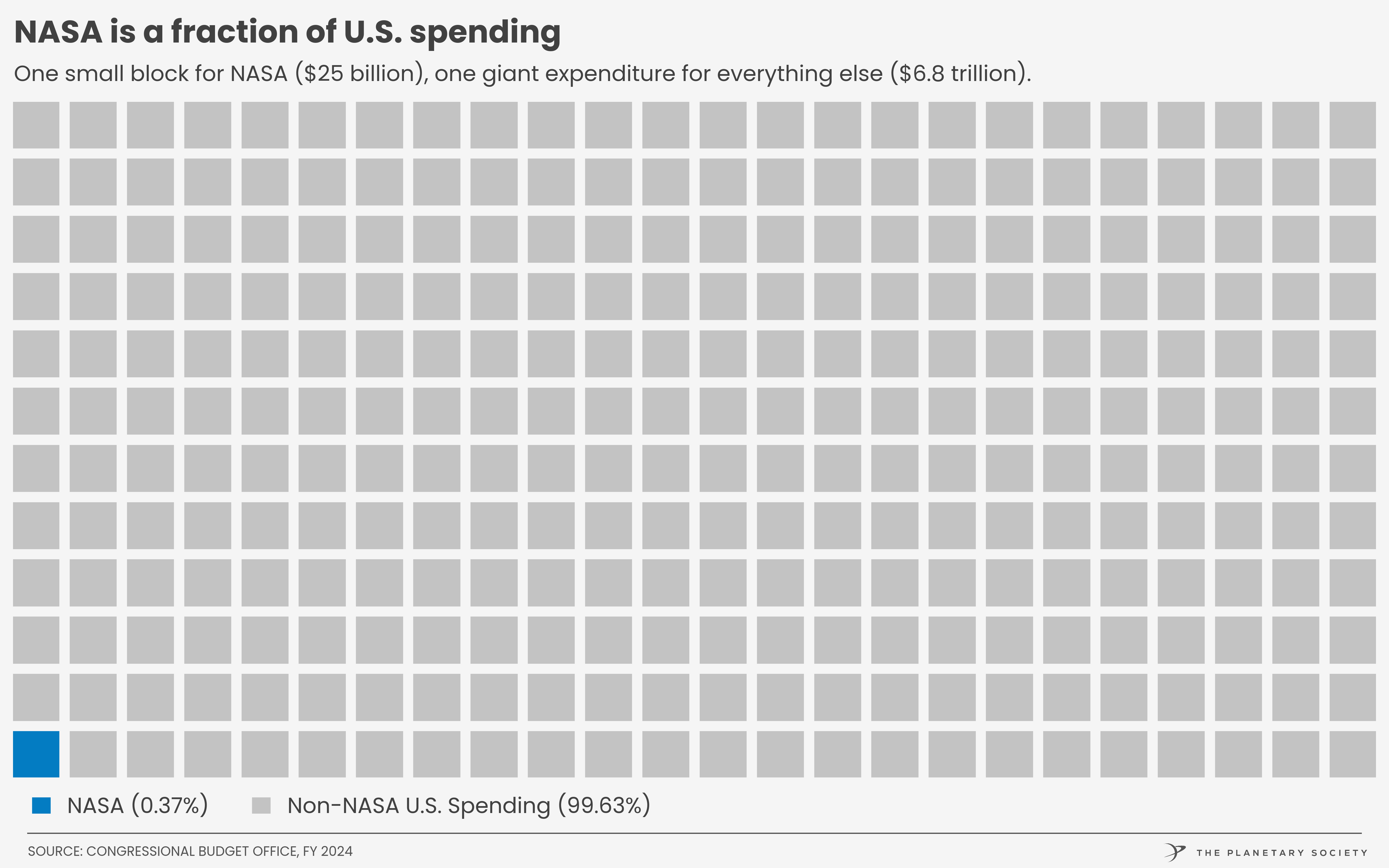 Download OptionsEach block in this chart represents one NASA's-worth of expenditures by the United States: $25 billion. In 2024, the federal government spent $6.8 trillion—equal to 272 NASAs.